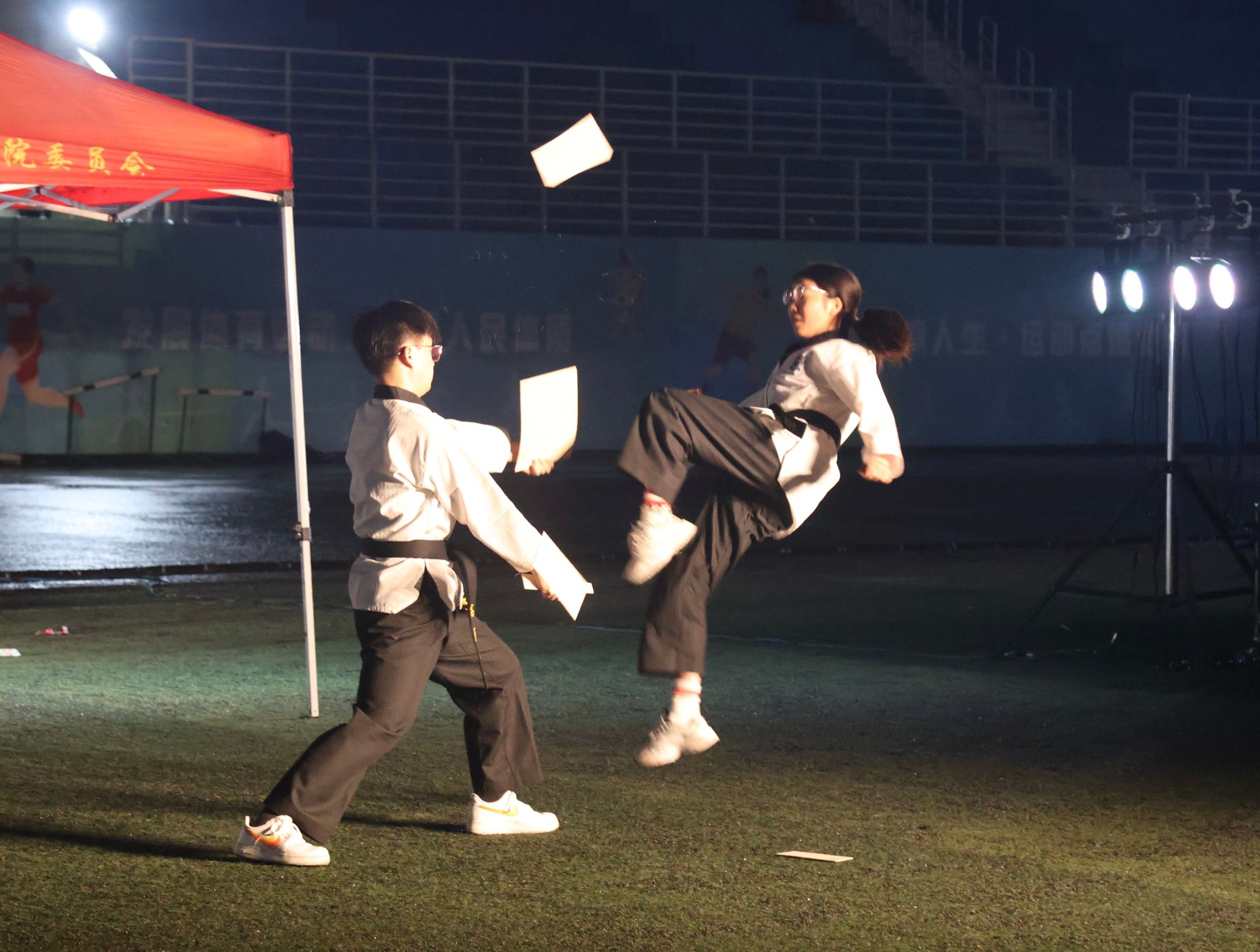 傍晚18点30夜幕降临,社团文化艺术节晚会准时开启。中西音乐文化社以《我的未来式》《静止》两首歌曲带领同学们走进音乐的海洋,青春旋律瞬间将点燃晚会氛围;演讲与口才协会的朗诵《青春的交响》用铿锵语言勾勒理想蓝图,引发新生共鸣;大学生艺术团的合唱《霸王别姬》荡气回肠,重现千古英雄豪情;舞次方社团接连带来《古舞流芳·疆韵飞扬》《Style》《Girls Will Be Girls》《舞蹈串烧》节目,精彩的舞蹈演出从古典西域风情到现代潮流节奏,展现舞蹈多元魅力,台下掌声频频;盒子动漫社的《这么可爱真是抱歉》表现元气满满,展现青春气息;魔术协会《奇迹时刻》邀观众上台互动,妙趣横生的魔术手法赢得阵阵惊呼;大学生艺术团表演队带来的小品《你好,老师》以校园故事引发新生对未来大学生涯的规划和思考;军事爱好者协会《砺刃》表演者为我校退役大学生,他们的战术摔擒表演刚劲有力,尽显皖医青年热血风采;英语角协会《Take Me To Your Heart》用温柔歌声打动人心;盒子动漫社的梦幻光影秀《影色舞》则用光影交织打造沉浸式视觉盛宴。红十字协会《以青春践行公益路,用奉献致敬生命歌》朗诵传递志愿精神;中西音乐文化社的歌曲《落叶归根》娓娓道来,为细雨中驻足观看的观众带来了温暖和力量;晚会最后在跆拳道协会《“跆”启未来》展现速度与力量的碰撞中落下帷幕。