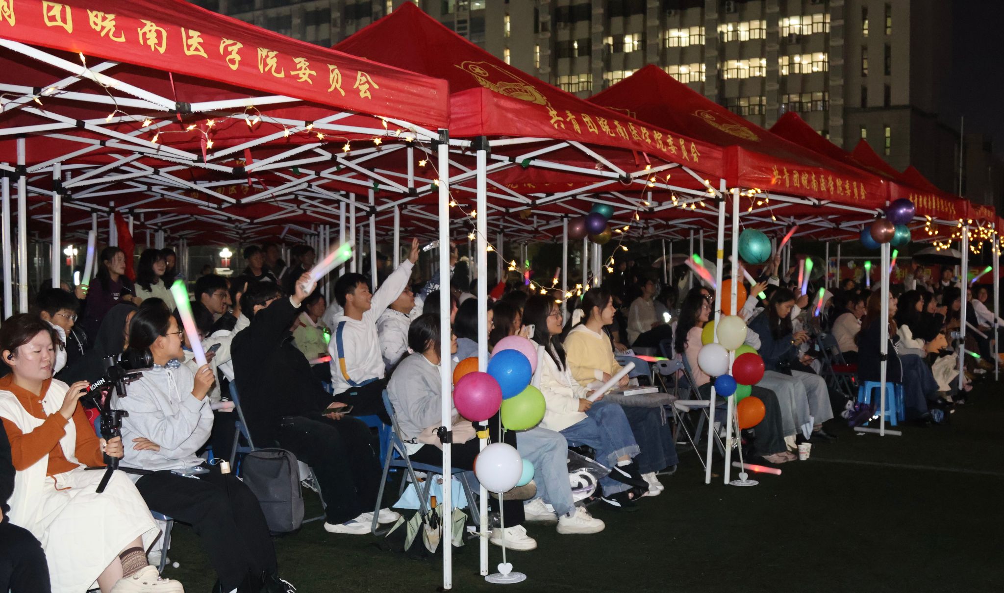 晚会穿插的互动环节更是将气氛推向新高。“听歌识曲”环节中,现场观众争相举手抢答,跟着旋律哼唱经典曲目;“正话反做”游戏考验反应速度,台上参与者手忙脚乱的模样惹得全场大笑,获胜者收获精美礼品,未得奖的同学也在欢笑中感受活动乐趣。虽然天公不作美,但依然有不少同学亲临现场。2025级新生李沐阳说:“从招新展区的社团体验到晚会的精彩表演,每一刻都让我感受到皖医的活力!我已经加入了演讲与口才协会,希望在这里锻炼自己,结识更多志同道合的朋友。”同为新生的张雅琪则表示:“光影秀和舞蹈表演太惊艳了,互动游戏也很有趣,现在我对大学生活充满期待,想多参与社团活动丰富自己。”