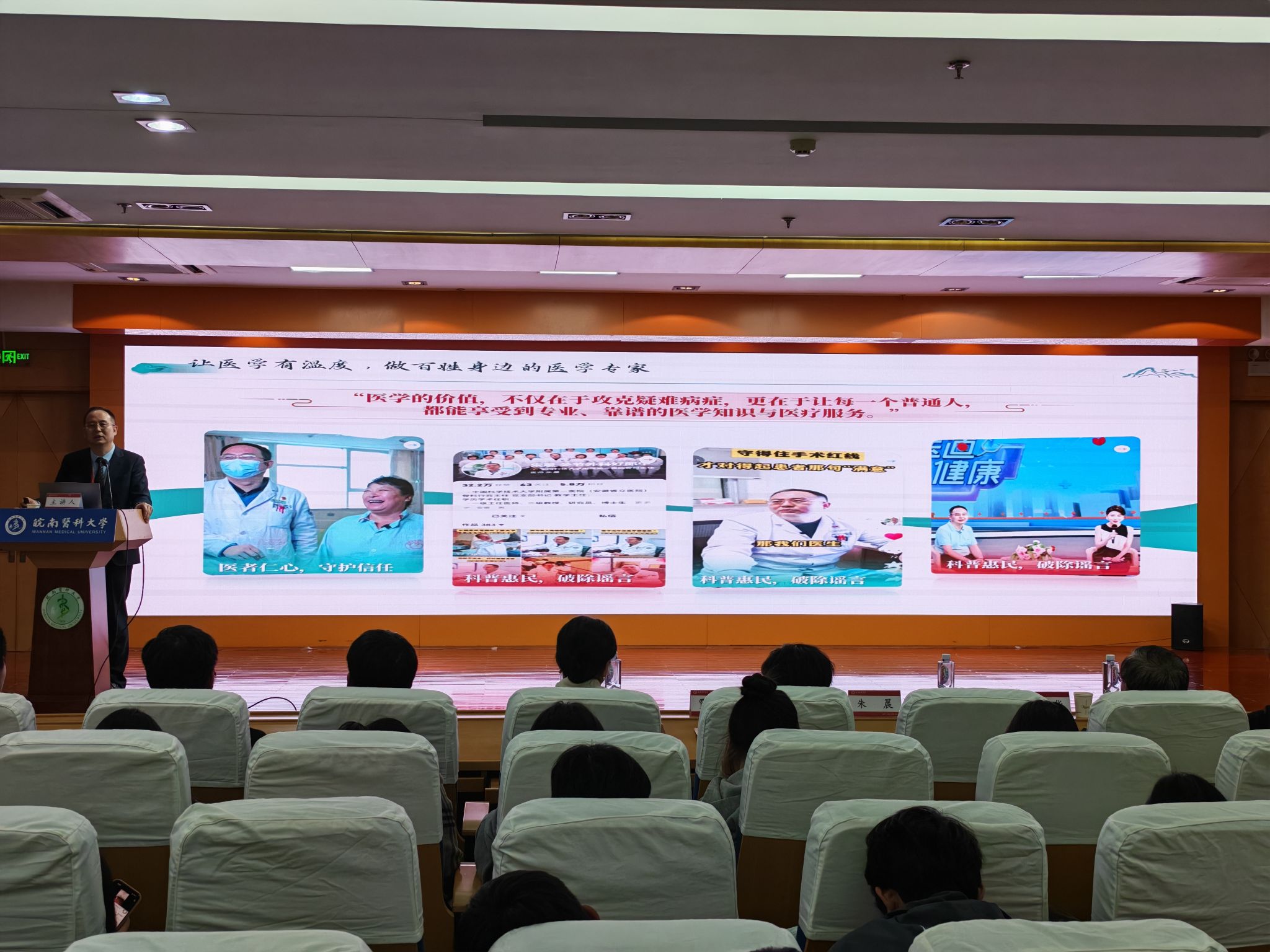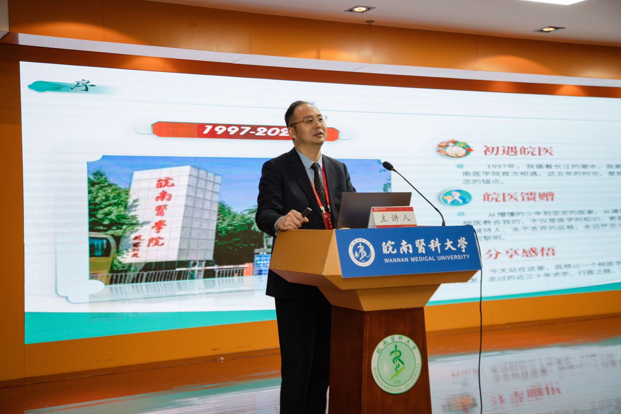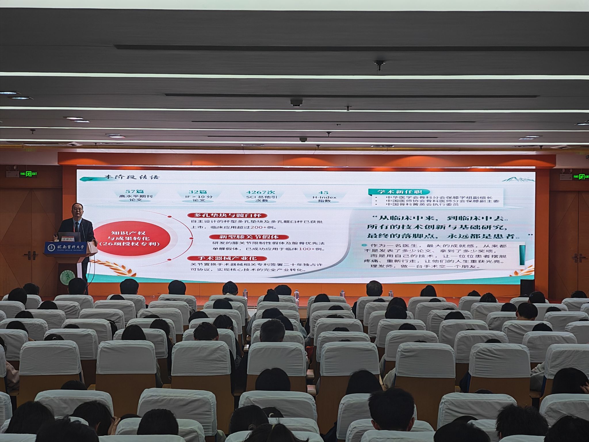 从医二十余载,朱晨教授始终坚守临床一线、深耕科研创新,持续精进学业,完成硕士、博士、博士后深造,牵头组建临床与科研团队,致力于骨科诊疗技术攻关与成果转化。他先后荣获国家优秀青年医师、安徽省学术和技术带头人、江淮英才培养计划杰出人才、教育部长江学者特聘教授等重磅荣誉,担任多项国家级、国际重要学术职务,主持国家自然科学基金等多项重大科研项目,发表高水平论文 57 篇,授权国家专利 26 项,牵头制定多项行业专家共识与标准,以精湛医术和卓越成果,推动骨科技术走向全国、走向世界。他始终坚持人文行医,用心对待每一位患者,用温度诠释医者担当,致力成为百姓身边靠谱暖心的医学专家。报告尾声,他深情地说“我永远都是皖医的一名学子,永远为自己是皖医人而骄傲。始于懵懂,终于热爱,感恩母校赋予的白衣荣光。”并鼓励学弟学妹们守住初心,不负韶华,不负母校的培养,不负患者的信任,在医学这条路上,走出属于自己的精彩人生。