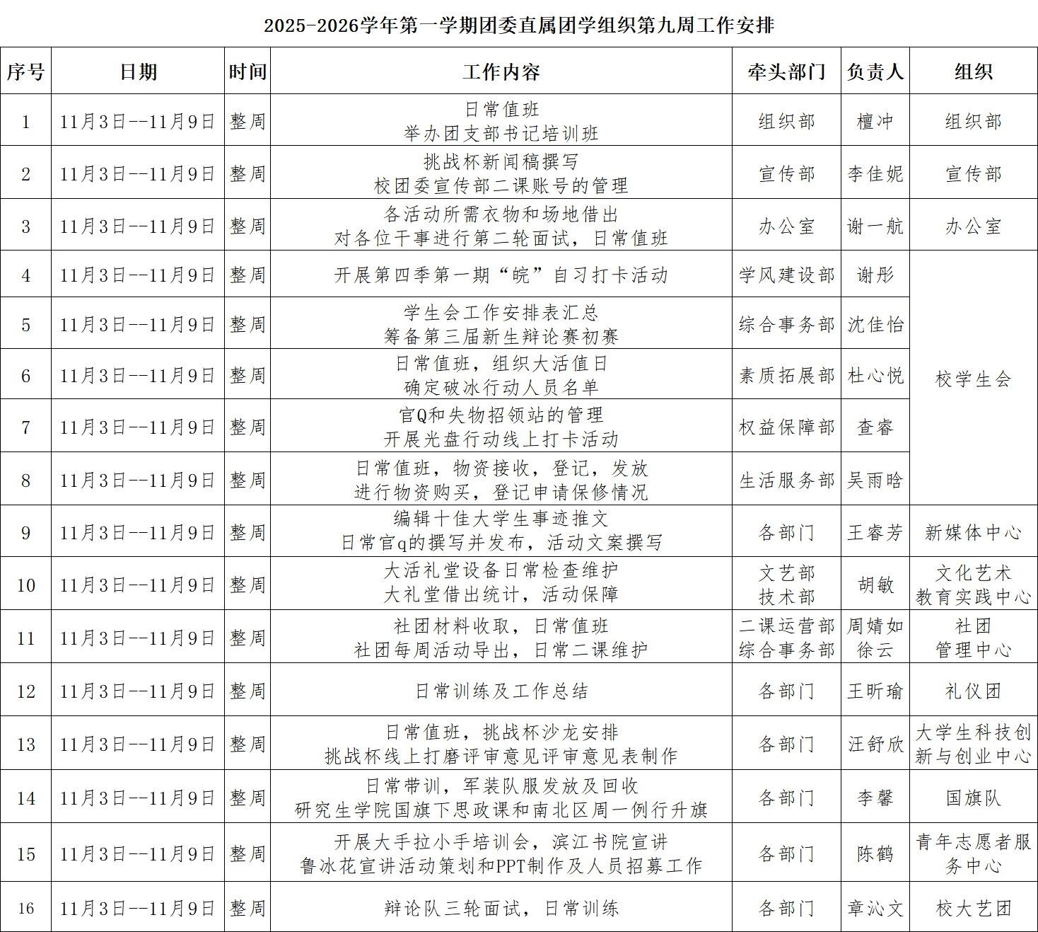 2025-2026学年第一学期团委直属团学组织第九周工作安排