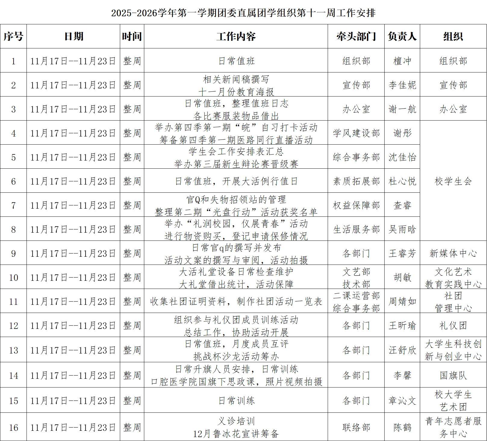 2025-2026学年第一学期团委直属团学组织第十一周工作安排