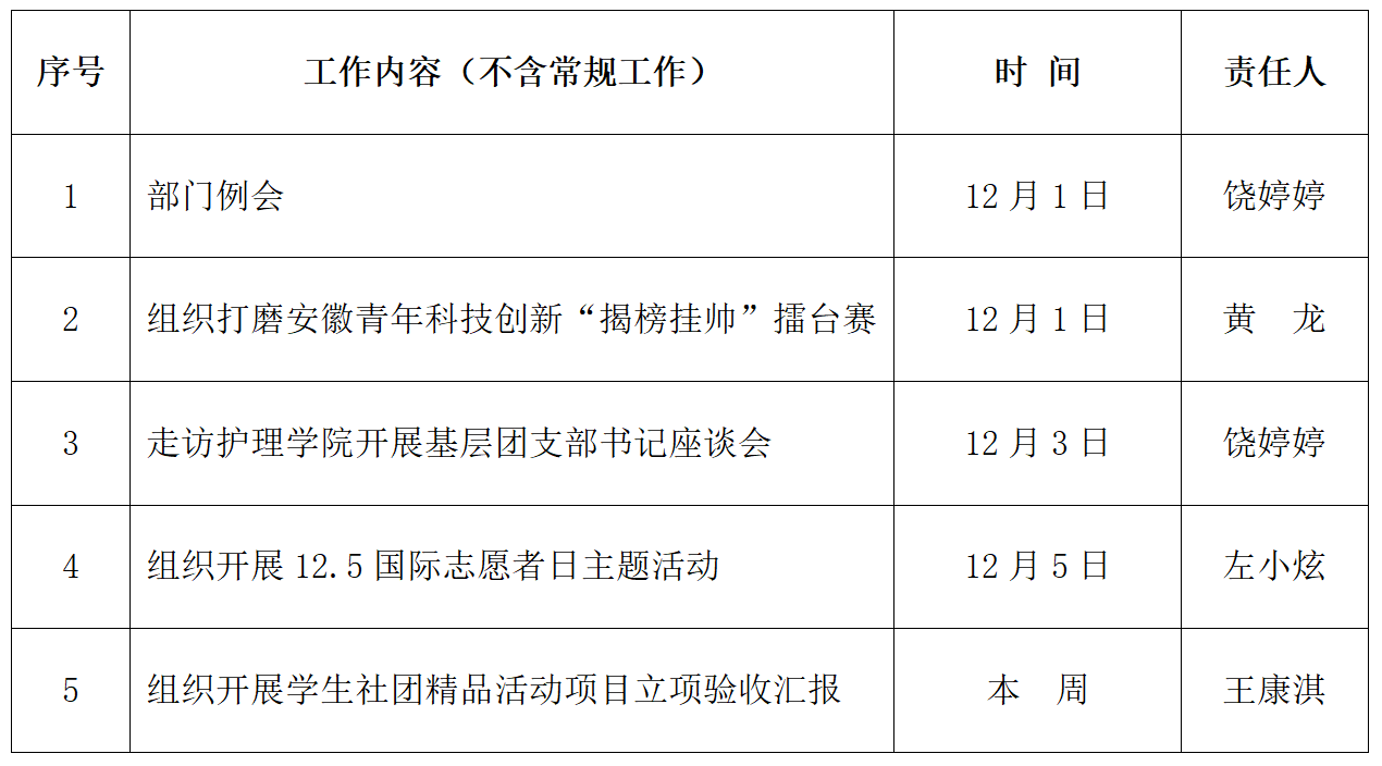 校团委2025-2026学年第一学期第十三周主要工作安排表
