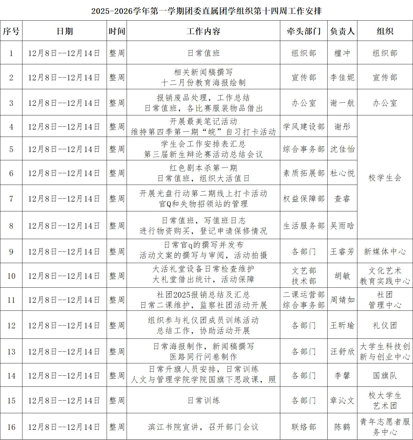 2025-2026学年第一学期团委直属团学组织第十四周工作安排