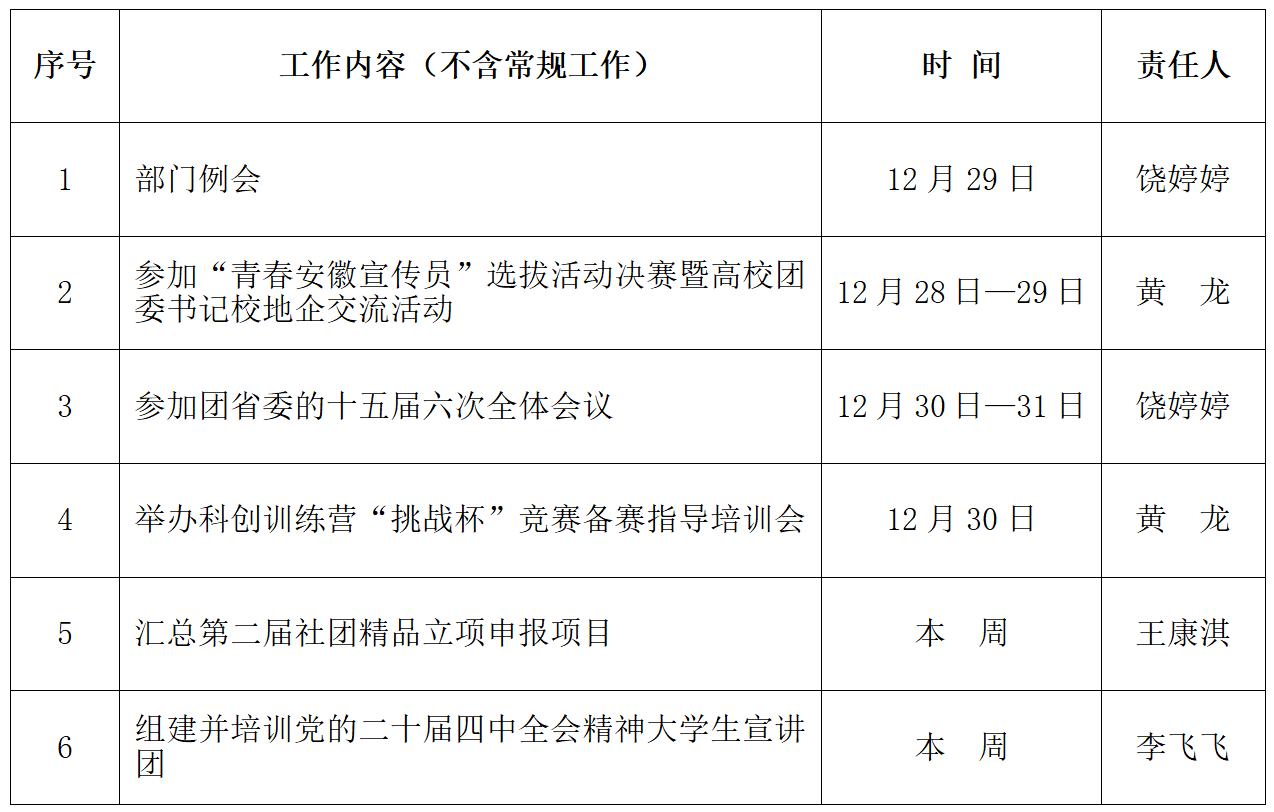 校团委2025-2026学年第一学期第十七周主要工作安排表