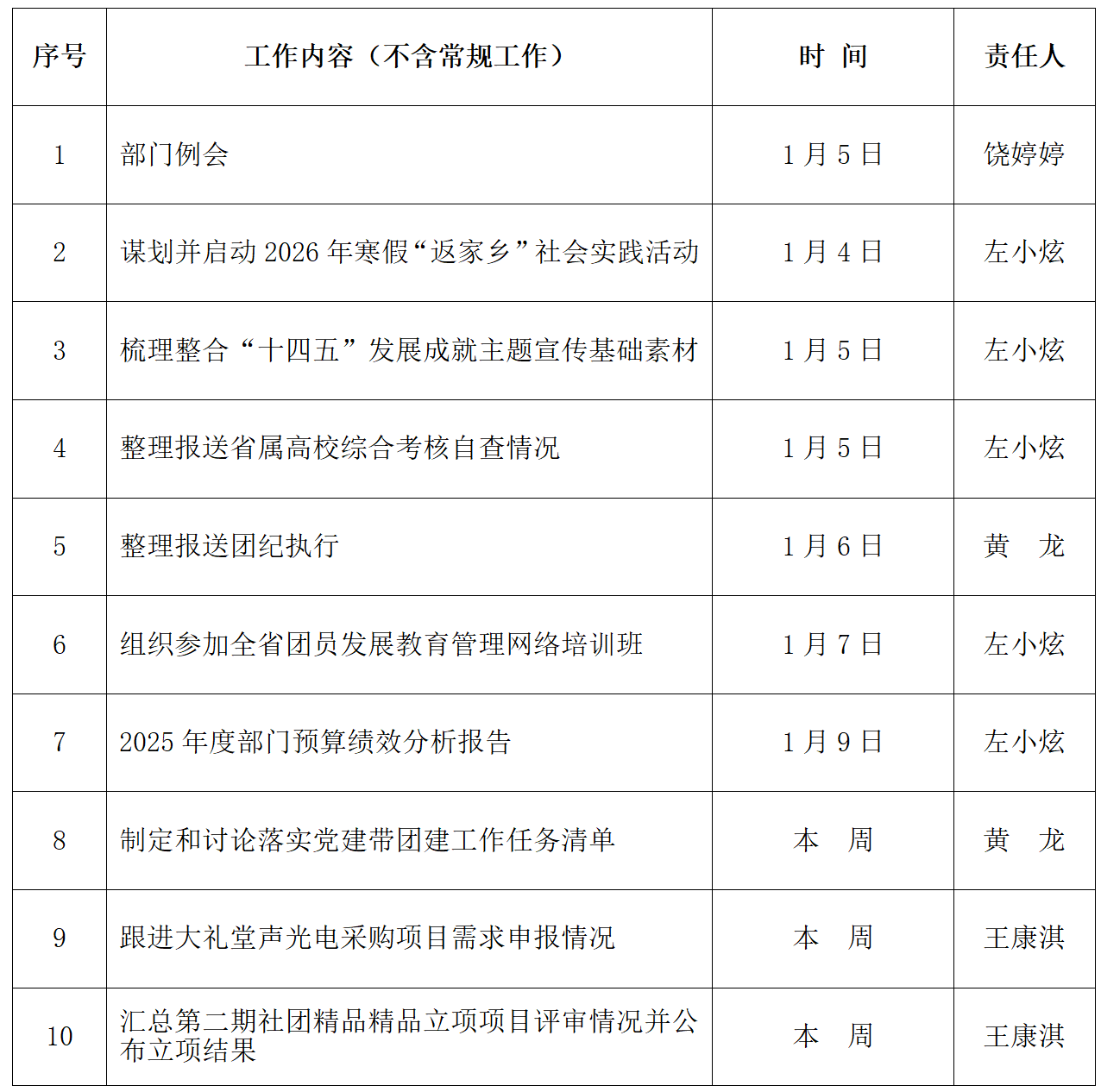 校团委2025-2026学年第一学期第十八周主要工作安排表